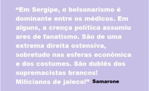 Em Sergipe, o bolsonarismo é dominante entre os médicos. Em alguns, a crença política assumiu ares de fanatismo. São de uma extrema direita ostensiva, sobretudo nas esferas econômica e dos costumes. Como é uma moda recente no Brasil, é uma extrema direita rude e simplória. Ainda não tiveram tempo para um aprofundamento doutrinário.