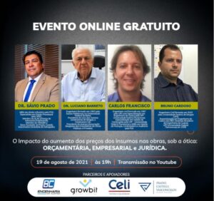 Evento online gratuito: O impacto do aumento dos preços dos insumos nas obras, sob a ótica: orçamentária, empresarial e jurídica. Nesta quinta-feira, 19, à partir das 19h, renomados profissionais das áreas de direito, empresarial e de engenharia debaterão o tema. Link para inscrição: https://landingpage.growbit.com.br/bcengenharia/evento/ O evento é uma parceria da BC Engenharia de Custos, Growbit (empresa especializada em marketing e vendas) Construtora Celi e do escritório Prado, Castelli, Vasconcelos Sociedade de Advogados. Transmissão aqui: https://www.youtube.com/channel/UCKOzj-JN74pFo5l3ofClfAw