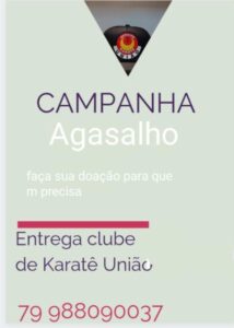 Campanha agasalho: Clube de Karatê União arrecada agasalhos para entregar a moradores de rua O Clube de Karatê União fundado há 30 anos tem como um dos seus princípios realizar campanhas para ajudar a comunidade carente, englobando os alunos mostrando a necessidade de um olhar responsável na missão social. O Clube tem um projeto gratuito de ensinar karatê no Lar Esmeralda, em São Cristóvão, que atende crianças carentes. Anualmente são realizadas gincanas para congregar os alunos e pais e os alimentos e materiais de limpeza arrecadados são doados às instituições que cuidam de pessoas carentes. Desta forma, os que fazem o Clube de Karatê União acreditam que estão formando não apenas campeões no esporte, mas cidadãos com a consciência de ajudar o mais próximo. Agora está arrecadando até o final deste mês agasalhos para entregar aos moradores de rua. A cada 10 peças os integrantes saem às ruas para entregar a quem está precisando. Se quiser ajudar é só ligar para o (79) 98809–0037.
