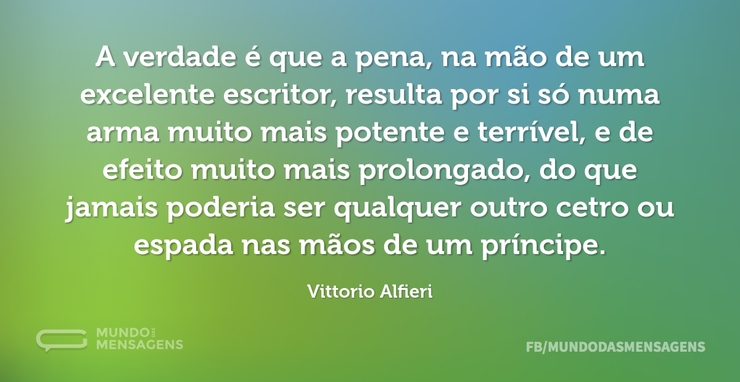 “A verdade é que a pena, na mão de um excelente escritor, resulta por si só numa arma muito mais potente e terrível, e de efeito muito mais prolongado, do que jamais poderia ser qualquer outro ceptro ou espada nas mãos de um príncipe.” Vittorio Alfieri.