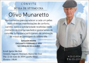 Missa de Sétimo Dia – Olivo Munaretto, hoje 22 A família de Olivo Munaretto ao tempo que agradece a cada um pelas diversas manifestações de conforto, carinho, apoio e solidariedade recebidas neste momento de imensa saudade, convidam a todos para participarem da celebração da Missa de Passagem do Sétimo Dia que será realizada na Igreja São José em Aracaj hoje, 22, às 19h30.