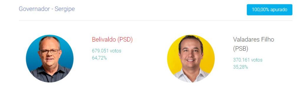 O atual Governador do Estado de Sergipe, Belivaldo Chagas (PSD) foi reeleito neste segundo turno das Eleições 2018. Ele obteve 64,72%, com 679.051 votos. Já o candidato da oposição, Valadares Filho (PSB), obteve 35,28% com 370.161 votos. Belivaldo tem 596.318 (64,66%) votos e o outro candidato, Valadares Filho, 328.532 (35,34%). No primeiro turno, Belivaldo teve 403.252 votos (40,84%) e Valadares Filho teve 212.169 (21,49%).
