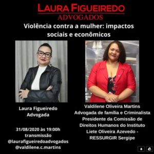 Live hoje, 31/08, às 19h Violência contra mulher: impactos sociais e econômicos Uma abordagem diferente sobre a questão da violência contra a mulher será o tema da live de hoje com a advogada Laura Figueiredo e a advogada de família e criminalista, presidente da Comissão de Direitos Humanos do Instituto Liete Oliveira Azevedo – RESSURGIR/SE, Valdilene Oliveira Martins. Não perca: https://www.instagram.com/laurafigueiredoadvogados/