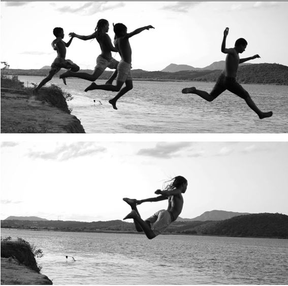 Da série de fotografias do cidadão Wanderson Andrade: https://www.instagram.com/wanderson_bnw/ Meninos quilombolas brincam no rio São Francisco, jogando-se de uma ribanceira. Eles dão cambalhotas antes de cair nas águas do rio. Garotos da comunidade Mocambo. As fotos: