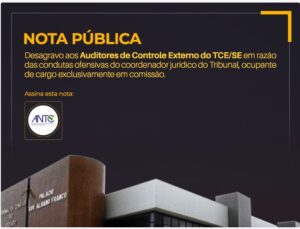 Associação Nacional de Auditores repudia TCE/SE pelo que considera conduta ofensiva do atual ocupante do cargo de coordenador jurídico do Tribunal que é sócio de escritório privado Em Nota Pública, a ANTC desagrava os Auditores de Controle Externo do Tribunal de Contas do