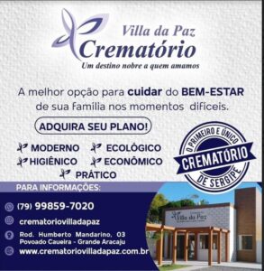 fim Sergipe tem um crematório. O titular deste espaço sempre defendeu a implantação desta alternativa para os sergipanos. Hoje, quem morre em Sergipe ou é cremado em Salvador – como foi o saudoso professor Marcelo Déda – ou em Alagoinhas, também na Bahia em 2018. O Villa da Paz está localizado na região Metropolitana de Aracaju, no povoado Caueira, em Itaporanga. Basta atravessar a ponte jornalista Joel Silveira. Pelo avanço da modernidade, hoje, a cremação não é uma opção apenas por falta de espaço, mas de higiene, ecologicamente correto e até mais prático.