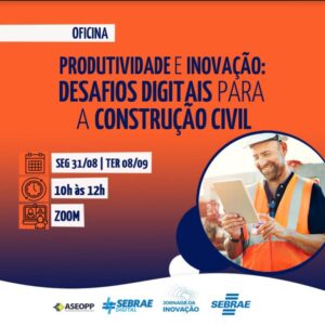 construção civil A transformação digital está transformando todos os tipos de negócio. A pandemia deixou claro que as ferramentas digitais são essenciais quando se fala em ganhos de produtividade. No segmento da construção civil essa realidade não é diferente. Pensando nisso, o SEBRAE e a ASEOPP promovem uma oficina com foco nas ferramentas digitais que aumentam a produtividade das empresas. Aqueles que tiverem interesse em participar deverão preencher o link: https://forms.office.com/Pages/ResponsePage.aspx?id=cYIpl9cbxUqTW4it3vY2zGdGMRZ1_fRKsHTy9J1vWvNUNlVKSUxPSkIzSVc2MFdWRVNaQzc0RzlXTy4u As inscrições são gratuitas.