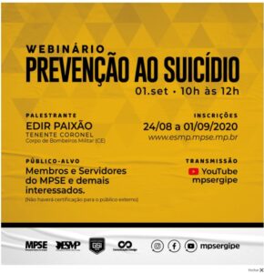 “Prevenção ao Suicídio” O Ministério Público de Sergipe, por meio da Escola Superior (ESMP) e do Gabinete de Segurança Institucional (GSI), promoverá – também como parte da programação do mês da Segurança Institucional – o Webinário “Prevenção ao Suicídio”, no dia 01 de setembro, das 10h às 12h. O evento será voltado para membros, servidores e estagiários do MPSE, e demais interessados. A transmissão será feita por meio do canal do MPSE no YouTube. O objetivo do evento é tratar sobre o histórico, conceitos, estatísticas mundiais e nacionais, fases do suicídio, tipos de pensamentos suicidas, identificação de sinais de alerta, bem como o acolhimento e encaminhamento a serviços de saúde. O palestrante do Webinário é o tenente-coronel do Corpo de Bombeiros Militar do Estado do Ceará (CBMCE), Edir Paixão. Como não tem certificado para o público externo, não é necessário fazer inscrição, é só acessar: https://www.youtube.com/channel/UCa_g88U9kOh0k2XNK6V745Q