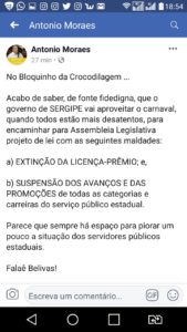 No bloquinho da crocodilagem Pelo zap Antônio Moraes: “Acabo de saber de fonte fidedigna, que o governo de SERGIPE vai aproveitar o Carnaval, quando todos estão mais desatentos, para encaminhar a Assembleia Legislativa projeto de lei com as seguintes maldades: a) extinção da licença-prêmio; b) Suspensão dos avanços e das promoções de todas as categorias e carreiras do serviço público estadual. Parece que sempre há espaço para piorar um pouco a situação dos servidores públicos estaduais. Falaê Belivas!”