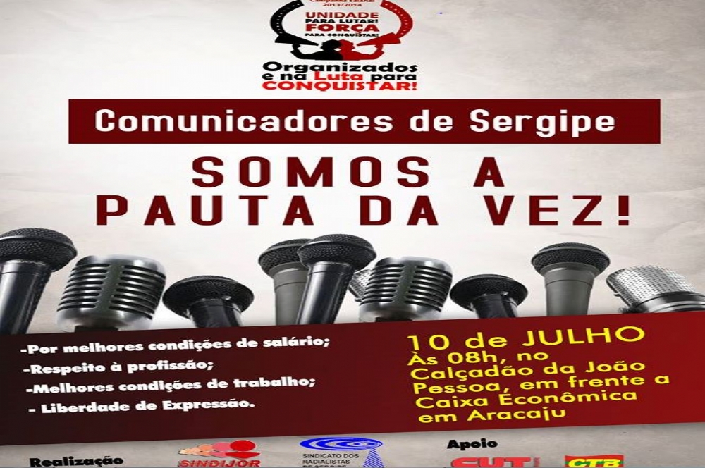 Os profissionais da comunicação de Sergipe realizam ato público na próxima quarta-feira, 10, a partir das 8h no calçadão da rua João Pessoa em frente ao prédio da Caixa Econômica Federal. O objetivo do ato é dialogar com a sociedade sergipana sobre a situação dos trabalhadores da comunicação em Sergipe. “Ao contrário da aparência, a vida do comunicador sergipano é muito difícil, os salários são baixos e há uma precariedade nas condições de trabalho”, aponta a presidenta do Sindijor/Se, Caroline Santos.