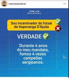 Atenção Ministério Público Eleitoral: pré-candidato a deputado estadual, Marcelo Sobral, filho do prefeito de Itaporanga D`Ajuda, faz propaganda nas redes sociais como se fosse o prefeito: “Sou incentivador do futsal de Itaporanga, durante quatro anos do meu mandato fomos quatro vezes campeões sergipanos.” No print acima que foi rechaçado pela população local, ele mostra que quem é o prefeito é ele e que o pai, Otávio Sobral, é mera figura decorativa.