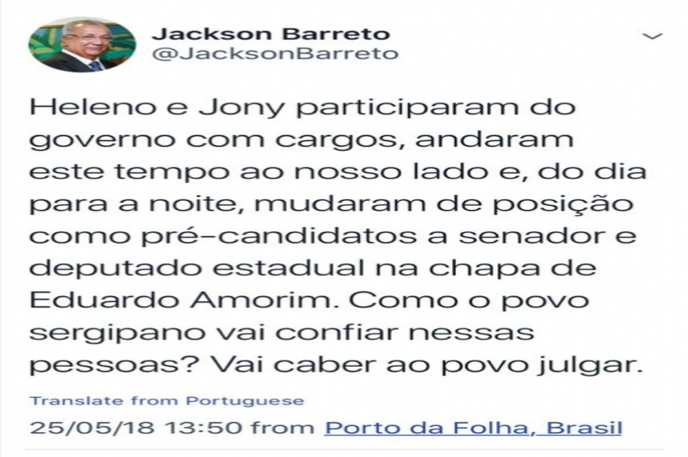 cargos, andaram todo este tempo todo ao nosso lado e, do dia para a noite, mudaram de posição como pré-candidatos a senador e deputado na chapa de Eduardo Amorim. Como o povo sergipano vai confiar nessas pessoas? Vai caber ao povo julgar.” Depois o texto foi retirado, mas a entrevista está no Facebook: https://www.facebook.com/reporterbobjunior/videos/2132549563690530/ Só para lembrar: sobre Eduardo Amorim, em 2010, estavam todos juntos, não só Déda, mas Valadares e Jackson como coordenador da campanha do então candidato a Senador. A motivação contra Heleno e Jony só tem um motivo: o desespero eleitoral de Jackson.
