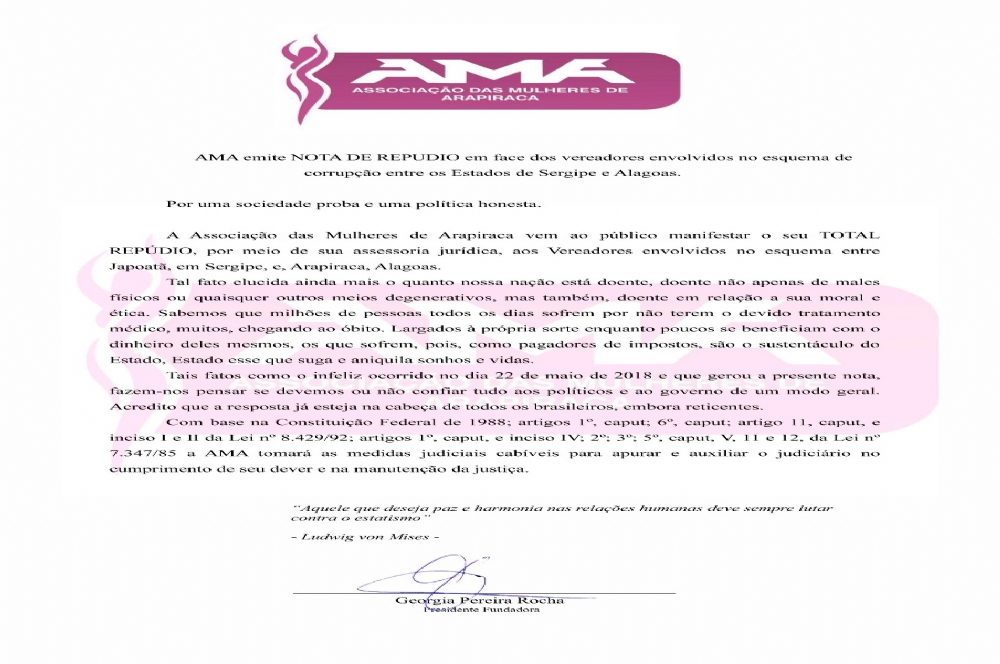 Nota que o vereador de Japoatã, Manoel do Assentamento, enviou para o programa Jornal da FAN 2ª edição: “Venho, através desta mostrar toda minha revolta com relação as informações passada pela Senhora Geórgia Rocha, presidente da (AMA), onde a mesma fez várias denúncias mentirosas e informações equivocadas, a mesma afirma várias coisas absurdas onde fala que o vereador Luiz e o Vereador Manoel tem acesso livre para marcação de exames no município de Arapiraca, nunca tive em nenhum órgão público do município de Arapiraca, nem mesmo para ser atendido quanto mais para marcar exames médicos, da mesma forma o vereador Manoel está indignado, onde o mesmo nunca fez marcação de exames naquele município, Geórgia também relatou outras informações inverídicas. Sabemos dos problemas que enfrentamos no dia a dia por falta de um bom na saúde pública do nosso país, e isso nos coloca na posição de ajudar e não de atrapalhar as pessoas que estão a muito tempo na fila esperando por uma cirurgia ou um exame médico. A sociedade de Arapiraca pode ficar tranquila porque nunca ouve nenhuma interferência dos vereadores na saúde pública do mesmo município, estamos aqui para prestar qualquer esclarecimento que seja de interesse do povo de Arapiraca. Espero que a presidente da associação das mulheres de Arapiraca (AMA) tenha prova de todas as mentiras que a mesma falou, pois os vereadores Luiz da Autoescola e o vereador Manoel, estará entrando com uma ação contra a mesma.”