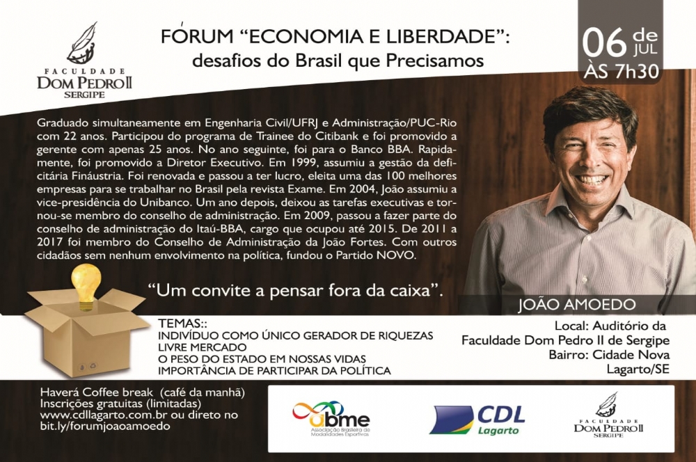 Fórum Economia e Liberdade Participe do Fórum Economia e Liberdade desafios do Brasil que precisamos com a presença confirmada do presidenciável, João Amoêdo. A data será no dia 06 de Julho, sexta-feira, às 7h30 (café da manhã), no auditório da Faculdade Dom Pedro II de Sergipe. Um convite a pensar fora da caixa! Venha conhecer e debater os temas: indivíduo como único gerador de riquezas, livre mercado, o peso do Estado em nossas vidas, a importância de participar da política e tantos outros temas sobre o Brasil que queremos. Atenção! Inscrições gratuitas, mas limitadas pelo site: http://www.cdllagarto.com.br (breve) ou pelo link direto: https://www.sympla.com.br/forum-economia-e-liberdade-desafios-do-brasil-que-precisamos-palestrante-joao-amoedo__294028 Realização/Apoio: ABME (Dep. Marketing) /CDL Lagarto e Faculdade Dom Pedro II de Sergipe.