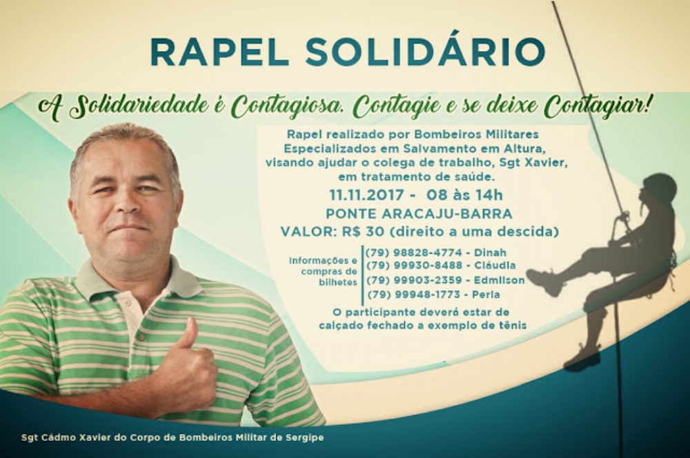 Participem do rapel solidário em prol do Sargento Xavier, visando ajudá-lo em seu tratamento de saúde. Além da causa, que é solidária, a galera que vai estar dando suporte, orientando os participantes, são os melhores do estado no salvamento em altura do corpo de bombeiros, bem como, terá a possibilidade de praticar este esporte que nos desafia a enfrentar nossos medos e desenvolver a auto confiança!…