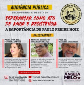 Hoje, 17, a partir das 9h: Audiência Pública marca abertura do Ano Educacional Paulo Freire em Aracaju “Esperançar como ato de amor e resistência: a importância de Paulo Freire hoje”. Este é o tema da Audiência Pública que será realizada pela Câmara Municipal de Aracaju hoje, a partir das 9h, com transmissão ao vivo pelos canais da CMA na televisão e no youtube. A atividade marca a abertura do Ano Educacional Paulo Freire em Aracaju, instituído através da lei 5.383/2021, de autoria da vereadora Professora Ângela Melo (PT), aprovada pela Câmara e sancionada pela Prefeitura. Visando discutir as contribuições de Paulo Freire para a realidade nacional e global destes tempos, a Audiência terá três palestrantes que pesquisam a obra freireana: Elza Ferreira Santos, Evanilson Tavares de França e Wanderley Geraldi. Elza é docente do mestrado profissional em Educação Profissional e Tecnológica do Instituto Federal de Sergipe (PROFEPT/IFS) e coordenadora do grupo de pesquisa Educação Profissional e Tecnológica do IFS/CNPq.Evanilson é professor da rede pública estadual de Sergipe e membro do Grupo de Estudos e Pesquisa Identidade e Alteridades: Diferenças e Desigualdades na Educação (GEPIADDE/UFS).Wanderley é escritor, professor titular aposentado da UNICAMP, colaborador visitante da Universidade do Porto e um dos autores do livro “Diálogos através de Paulo Freire”.