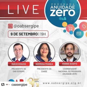 Live hoje, 09/09, ÀS 19h Anuidade Zero A recente adesão da nossa Seccional ao Programa Anuidade Zero permite que muitos colegas ainda tenham dúvidas sobre sua utilização, e afim de esclarecer mais sobre a #oabselive reúne o Presidente Inácio Krauss; a Presidente da Caixa de Assistência, CAASE, Hermosa França; e o Coordenador Nacional do Programa, Ronnie Duarte, para esclarecimentos ao vivo HOJE, 9, a partir das 19h. Aqui: https://www.instagram.com/oabsergipe/