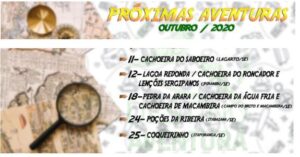 de 2020 às 6h/ Retorno dia 11 de outubro de 2020 ás 19h20 [Saída do estacionamento do Teatro Tobias Barreto (D.I.A.) Nível da trilha: Média (Escala de 1 a 10, 7,0) 14km no total. Pacote Inclui: Ônibus executivo; Trilha (guiamento); Almoço Galinha de Capoeira com pirão e Fotógrafo Profissional. Investimento: Até o dia 07/10/2020 – PROMOÇÃO! 2x nos cartões de R$ 45,00 ou R$ 75,00 a vista. Após 07/10/2020 2x nos cartões de R$ 47,50 ou R$ 80,00 a vista não trabalhamos com o Banese Card. Página no Facebook: www.facebook.com/destinoaventurase/