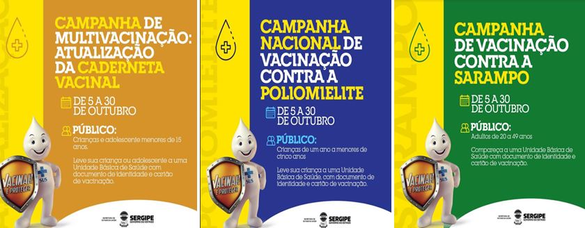 De hoje, 05, a 30 de outubro, serão iniciadas três campanhas de vacinação em Sergipe: contra o sarampo, voltada a adultos de 20 a 49 anos; contra a poliomielite, para crianças de 1 a menores de 5 anos; e a de multivacinação, que objetiva atualizar o calendário vacinal, para crianças e adolescentes menores de 15 anos.Para ser imunizado, basta comparecer à Unidade Básica de Saúde (UBS) mais próxima de você, com um documento de identidade com foto e caderneta de vacinação. Mais informações em www.saude.se.gov.br.