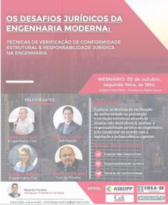 Webinário hoje, 05/10, às 19h Os desafios jurídicos da engenharia moderna Este é o tema do