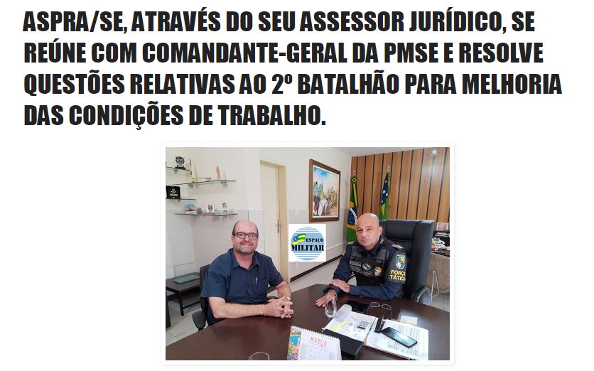 Na manhã desta quarta, dia 11, a ASPRA/SE (Associação dos Praças Policiais e Bombeiros Militares de Sergipe), através do seu assessor jurídico Dr. Márlio Damasceno, se reuniu com o Comandante-Geral da Polícia Militar do Estado de Sergipe, com o objetivo de tratar assuntos relativos ao 2º Batalhão, sediado em Propriá.