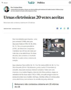 Todos sem voto impresso Seus rebentos Flávio (2002, 06, 10, 14 e 18), Carlos (2000, 04, 08, 12, 16 e 20) e Eduardo (2014 e 18) obtiveram, juntos, outros 13 mandatos (a vereador, deputado estadual, federal e senador). Todos sem voto impresso. A ex-mulher Rogéria, mãe dos três filhos políticos, elegeu-se vereadora do Rio duas vezes (1992 e 1996), uma pelo antigo e outra na estreia do então novo modelo. Até hoje, a família colheu 20 vitórias pelas urnas eletrônicas, sem reclamar do veredito da Justiça eleitoral. Aqui toda matéria: https://valor.globo.com/politica/coluna/urnas-eletronicas-20-vezes-aceitas.ghtml