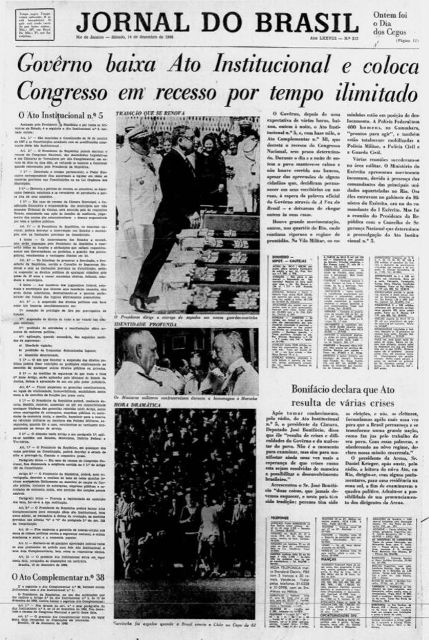 www.twitter.com/BernardoMF 1. Todo jornalista conhece (ou deveria conhecer) a capa do JB de 14/12/1968, o dia seguinte ao AI-5. Previsão do tempo: “Tempo negro. Temperatura sufocante. O ar está irrespirável. O país está sendo varrido por fortes ventos”. Chamada no alto da capa: “Ontem foi o Dia dos Cegos”