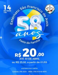 Externato São Francisco de Assis vai celebrar os 58 anos com a ‘Festa da Família’. Para celebrar os 58 anos do Externato São Francisco de Assis, a instituição vai realizar mais uma edição da ‘Festa da Família’ no dia 14 de maio, a partir das 14h, na sede, em Aracaju. O evento vai ser comandado por Fábio Lima, Zanny – A Braba do Piseiro e ainda com o Coletivo Mulheres no Samba (com roda de samba) e participações especiais de Soayan e Júlia Cristina, além da presença vip da miss teen Aracaju, Yasmin Vitória. A Festa da Família será apresentada pelos jornalistas Fredson Navarro, Denise Gomes e Marcele Machado e os ingressos já podem ser adquiridos da sede do Externato por apenas R$ 20.Será uma linda festa da solidariedade com uma mistura de ritmos. Uma das atrações mais esperadas é a cantora Zanny, a Braba do Piseiro, que vai apresentar seu novo show com muito alto astral e tem de tudo: axé, sertanejo, forró, arrocha e a sensação do momento que é o piseiro.O cantor Fábio Lima promete emocionar o público com todo o seu talento e repertório eclético com o melhor da MPB. A novidade da festa é a participação do Coletivo Mulheres no Samba (com roda de samba).Os ingressos estão sendo vendidos por R$ 20 (até o dia 30 de abril – o segundo lote começa no dia 1º de maio por R$ 25) na sede do Externato São Francisco de Assis que fica na Avenida Edézio Vieira de Melo, 585 – Suissa, Aracaju. Outras informações através do número (79) 3224-3509.