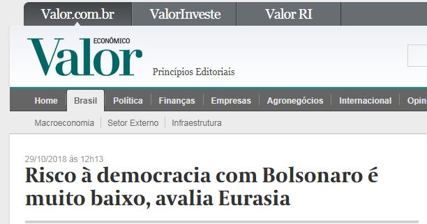 Um governo de Jair Bolsonaro (PSL) embute riscos à governança do país, mas a ameaça à democracia é muito baixa, avalia a consultoria de risco político Eurasia Group. Em relatório, a empresa diz não estar muito preocupada com a sobrevivência das instituições democráticas.
