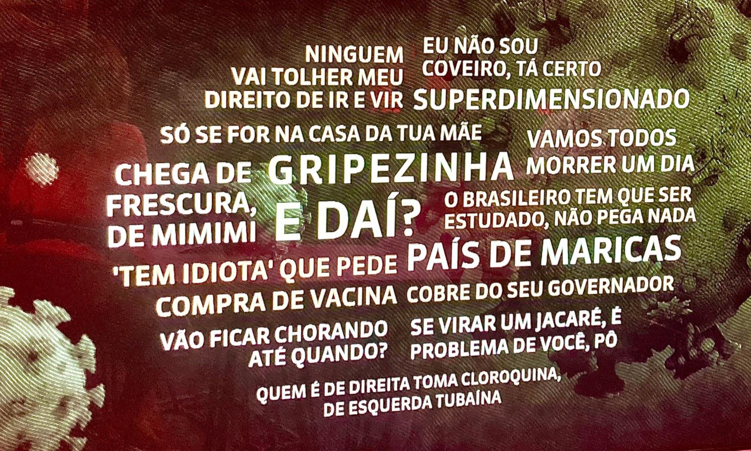 www.twitter.com/andretrig Hoje completa-se oficialmente 1 ano de pandemia! Observe a nuvem de palavras produzidas a partir do que foi dito pelo presidente Jair Bolsonaro neste período.Ontem 23% das mortes pela Covid em todo o mundo ocorreram no Brasil. Somos o epicentro da pandemia no planeta. Proteja-se!