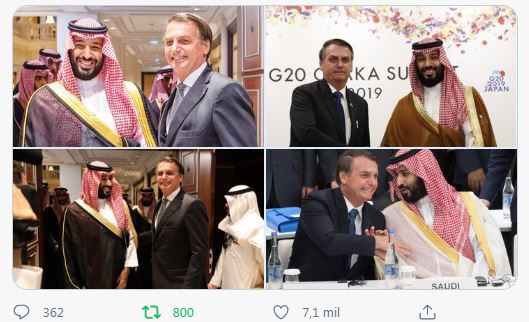www.twitter.com/gugachacra Algumas fotos de Bolsonaro com o ditador psicopata e sanguinário da Arábia Saudita, Mohammad bin Salman, acusado formalmente pelos EUA de ter ordenado o esquartejamento do jornalista dissidente Jamal Khashoggi no consulado saudita em Istambul. Tb mantém a mãe em cativeiro