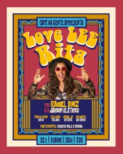 Amanhã, 01: Raquel Diniz e o Jardim Elétrico reverenciam Rita Lee no Café da Gente A Rainha do Rock será homenageada em solo sergipano amanhã, 01. Raquel Diniz e o Jardim Elétrico apresentam, no Café da Gente, a partir das 20h, o show ‘LoveLEE Rita’. Considerada um ícone do rock nacional, em seus mais de 50 anos de carreira a cantora paulista já lançou 32 discos e alcançou a marca de 55 milhões de cópias vendidas. O tributo reúne um repertório escolhido a dedo para marcar as muitas e grandiosas fases da trajetória de Rita Lee.Cinco talentos da música sergipana se uniram em torno do tributo, e prometem uma reverência à altura da arte e irreverência da Rainha do Rock. A cantora Raquel Diniz, o baterista Rafael Júnior, o baixista Fábio Oliveira, o guitarrista Vini Bufato e o pianista Italo Neno trazem um show com duas horas de duração, em que todas as fases de Rita Lee serão relembradas.