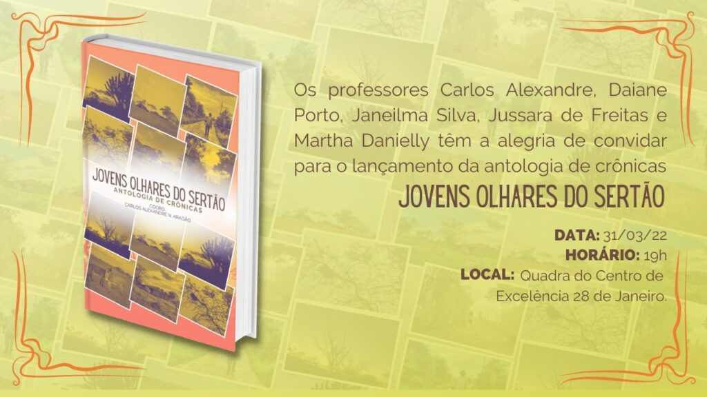 Nesta quinta-feira, 31/03/22, às 19h, na quadra do Centro de Excelência 28 de Janeiro, Monte Alegre de Sergipe, será lançada a obra “Jovens Olhares do Sertão: antologia de crônicas”, produzida por 23 estudantes do Ensino Fundamental e Médio das escolas estaduais situadas no município de Monte Alegre de Sergipe (Centro de Excelência 28 de Janeiro e Colégio Estadual José Inácio de Farias).