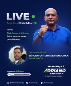 Live hoje, 21/07/, às 18h Eleições municipais: fake news e suas penalidades A live de hoje coordenada pelo presidente licenciado do Sinpol/SE e pré-candidato a vereador por Aracaju, Adriano Bandeira, terá a presença do juiz de direito Sérgio Fortuna de Mendonça. O tema é muito importante para as eleições que se aproximam: Fake News e suas penalidades! Participe: https://www.instagram.com/adrianobandeira.aju/