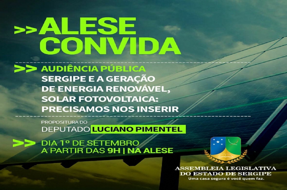 Energia Renovável tem audiência hoje na Alese No pequeno expediente da sessão plenária da Casa Legislativa, desta quinta- feira (31), o deputado estadual Luciano Pimentel (PSB) reforçou o convite para a Audiência Pública sobre Energia Renovável e Solar Fotovoltaica, a ser realizada hoje, no plenário da Alese, a partir das 09h.