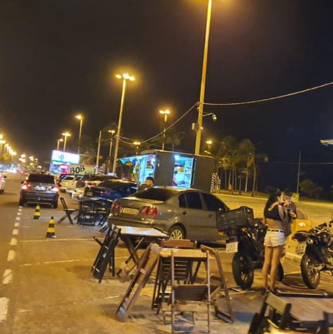 Aracaju já tem alguns food park todos em espaços privados, inclusive na região da Orla de Atalaia. Agora, com a omissão da Prefeitura de Aracaju, foi criado um novo food park utilizando o espaço público ao lado do estacionamento da Passarela do Caranguejo, já que o mesmo está fechando por conta da pandemia. Tomaram conta das vagas de estacionamento, colocaram mesas e cadeiras e até cones. Tudo com a omissão da Prefeitura, através da Emsurb e da SMTT, conforme a foto acima. Já a foto abaixo mostra que a Pandemia acabou na Passarela do Caranguejo. Está parecendo os domingos antes da pandemia, que até assassinato tinha. É porque a equipe de fiscalização da Prefeitura só trabalha quando tem equipe de televisão para filmar….