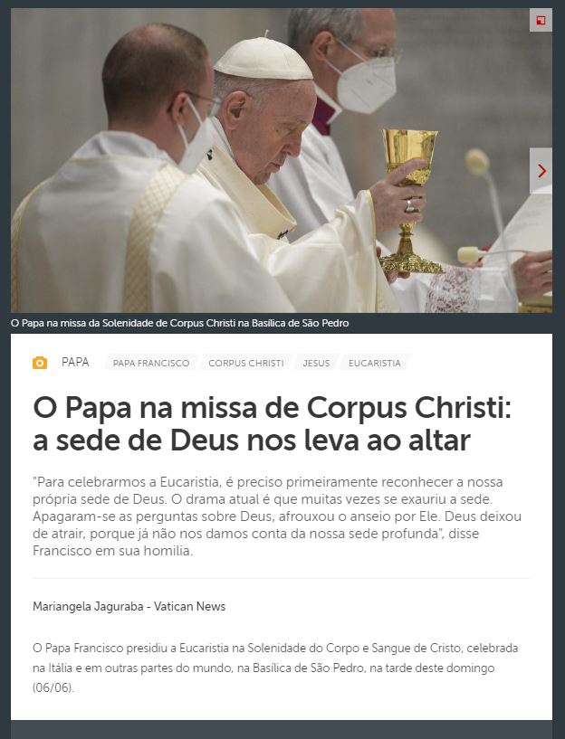 Ouça e compartilhe: https://www.vaticannews.va/pt/papa/news/2021-06/papa-francisco-missa-corpus-christi-eucaristia-sede-deus-altar.html