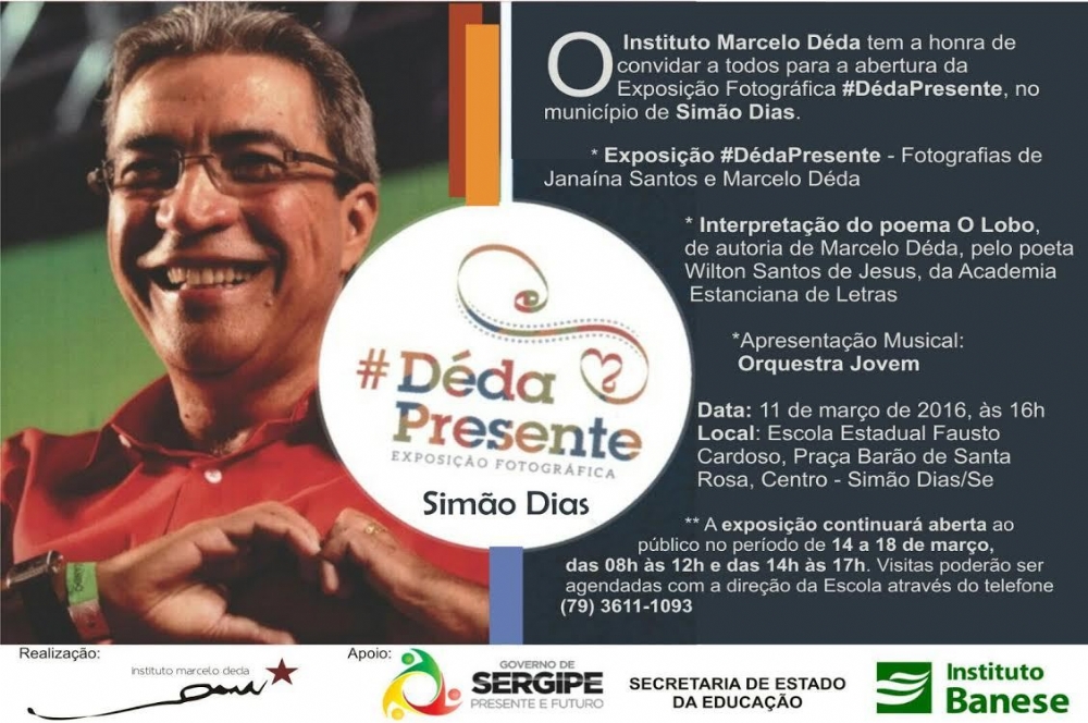 fotografias dele e da fotojornalista Janaina Santos através do Instituto Marcelo Déda. A partir das 11h de hoje, na Escola Estadual Fausto Cardoso no centro da cidade (a exposição ficará até o dia 18 de março). Além da exposição a interpretação do poema “O Lobo”, de autoria de Déda pelo poeta Wilton Santos e a apresentação da Orquestra Jovem, um sonho do governador Déda e da então primeira-dama, Eliane Aquino realizado no bairro Santa Maria em Aracaju, cujo projeto, o atual governador fez questão de continuar. “Quando escuto esta orquestra vem na lembrança as conversas com Déda”, revelou Jackson durante a apresentação da orquestra no Santa Maria no mutirão realizado no início deste mês.