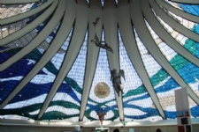 seus vitrais apresenta um rampa até o interior do templo, construída também com curvas que se encontram em sua base superior. A simetria das formas, os gramados e os pátios de concreto confirmam ainda mais a máxima de que a sinuosidade das obras de Niemeyer retrata um novo olhar para a arquitetura mundial.