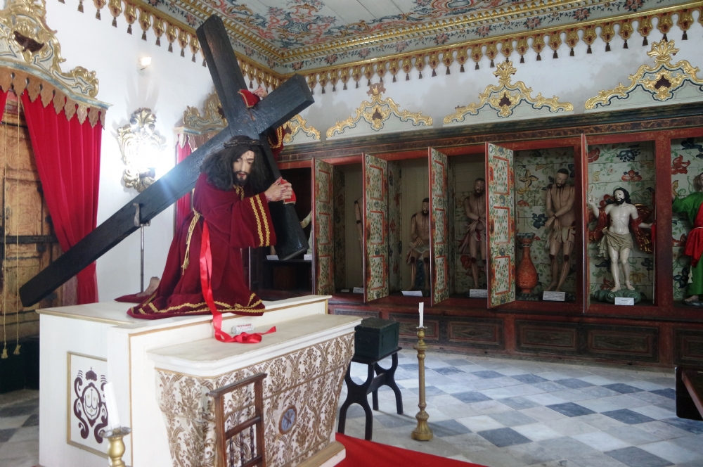 azulejos portugueses, abrigando também imagens de madeira de Macau.