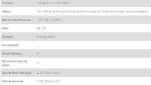 de última hora a Comissão de Licitação da Assembleia Legislativa mudou a data da licitação para serviços de publicidade, através da contratação de uma empresa, que seria dia 10 de dezembro. No dia 07 foi remarcada para o dia 05 de janeiro. Só lembrando que 08 foi feriado. E agora o Edital saiu com uma espécie de “pegadinha” que eles não destacaram em Vermelho.