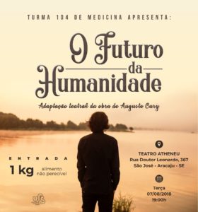 “O Futuro da Humanidade” Os alunos da Turma 104 de Medicina, da Universidade Federal de Sergipe (UFS), subirão ao palco do Teatro Atheneu na próxima terça-feira, 7, para encenar a peça “O Futuro da Humanidade”, uma adaptação teatral da obra de Augusto Cury. O espetáculo, que ocorrerá às 19h, será aberto ao público e o ingresso será 1kg de alimento não-perecível.