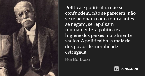 “Política e politicalha não se confundem, não se parecem, não se relacionam com a outra. Antes se negam, se repulsam mutuamente. a política é a higiene dos países moralmente sadios. A politicalha, a malária dos povos de moralidade estragada.” Rui Barbosa.