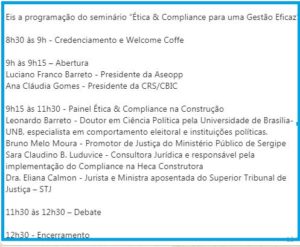Participantes Também participam do seminário o cientista político Leonardo Barreto; o promotor de justiça do Ministério Público de Sergipe, Bruno Melo Moura; a consultora jurídica e responsável pela implementação do Compliance na Heca Construtora, Sara Claudino B. Luduvice; o presidente da Associação Sergipana dos Empresários de Obras Públicas e Privadas (Apeopp), Luciano Franco Barreto, e a presidente da Comissão de Responsabilidade Social (CRS) da CBIC, Ana Cláudia Gomes.