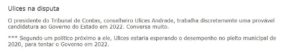 Ulices na disputa Deu no Fax Aju: O presidente do Tribunal de Contas, conselheiro Ulices Andrade, trabalha discretamente uma provável candidatura ao Governo do Estado em 2022. Conversa muito. Segundo um político próximo a ele, Ulices estaria esperando o desempenho no pleito municipal de 2020, para tentar o Governo em 2022.