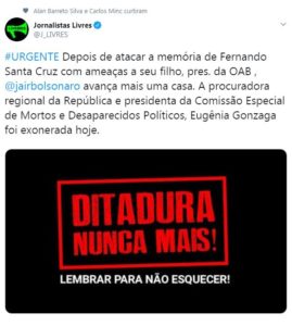 com ameaças a seu filho, pres. da OAB, @jairbolsonaro avança mais uma casa. A procuradora regional da República e presidenta da Comissão Especial de Mortos e Desaparecidos Políticos, Eugênia Gonzaga foi exonerada hoje.