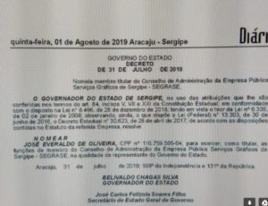 foi publicado o decreto governamental nomeando o ex-prefeito de Poço Verde, José Everaldo de Oliveira, como membro titular do Conselho de Administração da Empresa Pública Serviços Gráficos de Sergipe – Segrase. Everaldo é apenas mais um ex-prefeito de algumas dezenas. Aliás, está aí uma oportunidade para o TCE e o MPE trabalharem juntos e fiscalizarem um a um as atividades deles tanto nos conselhos como nos cargos comissionados que ocupam.