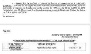 Advocacia Christian Cruz ao conseguir efetivar a matrícula do Médico Pedro Machado no Curso de Oficiais Médicos da PMSE, diga-se passagem prejudicado injustamente em concurso público no ano de 2006. Aqui publicação da PMSE datada de 18.07.2019 determinando a realização de exame médico já para o fim de matrícula no curso.