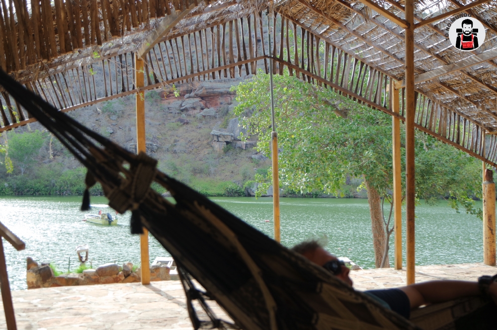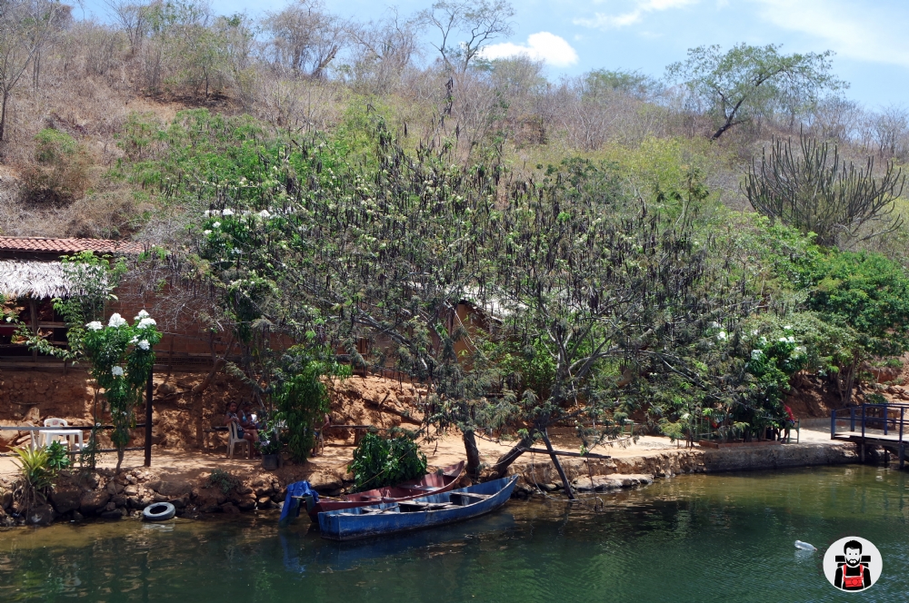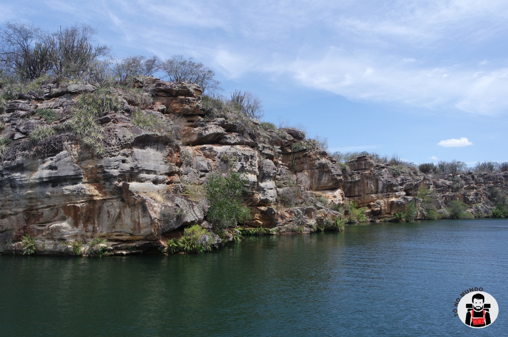 Os paredões arenosos entrecortados por vegetação composta por bromélias, cactáceos, samambaias, entre outras espécies, dão um tom esverdeado ao espelho d´água de rara beleza no sertão sergipano.