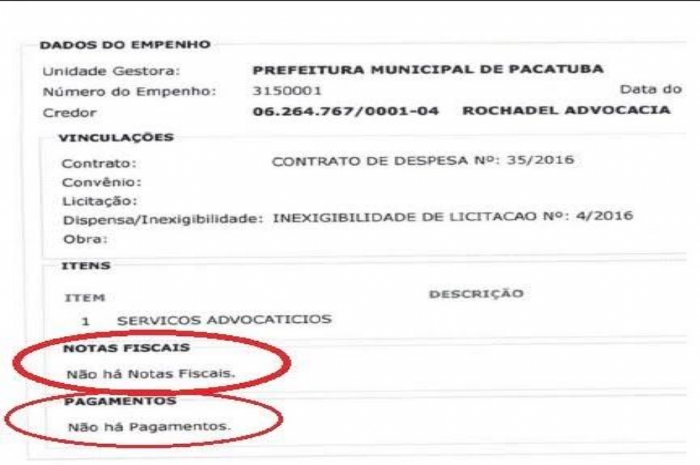 foi liquidada, não havendo qualquer tipo de pagamento. Ou seja, o escritório Rochadel, atuante na advocacia sergipana há mais de 15 anos, só irá receber os honorários contratados quando Pacatuba vier a receber os valores referentes aos royalties. Registro necessário para encerrar o mal entendido (print ao lado do portal da transparência).